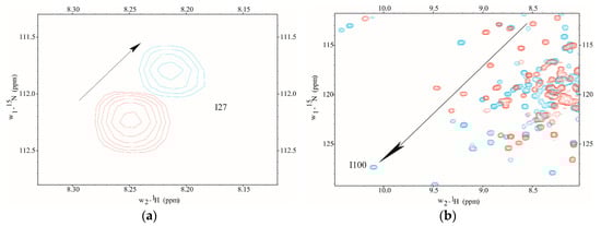The Ca2+-binding was monitored using 2D NMR to determine the amino proton-nitrogen chemical shifts for each amino acid residue mapping to metal binding sites I–IV in D22A. NMR chemical shift assignments were achieved by direct spectral comparison to previously reported values [,]. In the current study, we found that site-specific metal binding to D22A was evidenced by the direction and magnitude of amide proton-nitrogen chemical shift values observed in the presence of Ca2+-saturation (Figure 1). However, the addition of Ca2+ to D22A did not induce chemical shift perturbations at position 8 (I27), the metal occupancy reporter residue in CaM, an observation which is indicative of site I inactivation (Figure 1a). In contrast, Ca2+-induced downfield chemical shift changes were detected at position 8 (I100) in site III of D22A, which suggests that Ca2+-ligation in the C-terminal domain occurs in a manner comparable to CaMWt (Figure 1b).