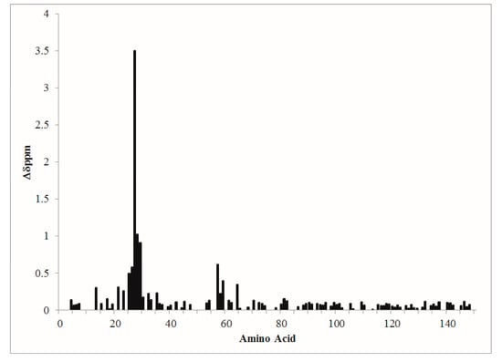 Composite amide-proton nitrogen chemical shift changes are plotted versus CaM amino acid sequence.