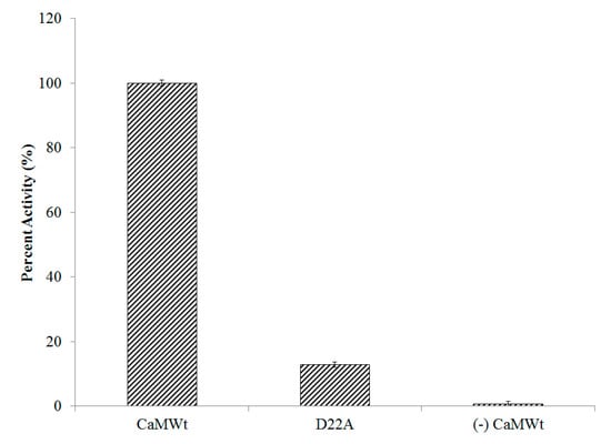 Site I inactivation in D22A reduces CyaA-ACD activity. Complexes consisting of CaMWt/CyaA-ACD were considered to have 100% enzymatic activity, whereas stimulation in the absence of CaMWt activator was a measure of basal level function. The activity reported for each sample was an average and the standard error calculated for three independent measurements each collected in triplicate.