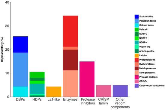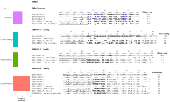 Antimicrobial peptides are present in all forms of life and take part in the innate host defense response against any external agents [45]. Some of these peptides, besides their antimicrobial activities, can modulate the host immune system [46,47]. The HDPs can be divided into the cysteine-rich peptides, e.g., the defensins [48] and the non-disulfide-bound peptides (NDBPs). We identified 17 transcripts potentially coding for HDPs from the venom gland of T. atrox, which represents more than 10% of all the annotated venom-related transcripts, confirming previous findings in other non-buthid species (Figure 5A).
