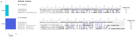 We identified 13 transcripts potentially coding for NaTxs in the transcriptome of T. atrox. Three of them showed sequence similarity to previously-reported α-NaTxs and 10 to β-NaTxs (Figure 2A and Supplementary Table S1) and two of these sequences corresponded to complete α-NaTxs coding sequences (CDS). Their closest match in terms of sequence similarity was the precursor of a toxin from Anuroctonus phaiodactylus (now known as Anuroctonus pococki bajae [21]) (UniProt Q5MJP5), with 47% and 43% sequence identity, respectively (Figure 2B). This reference toxin, originally named phaiodotoxin, is an insect-specific sodium channel-acting toxin. It defines an independent structural class, and has a peculiar biological activity on the para/tipE sodium insect channel, with both alpha (predominantly) and beta components [22].