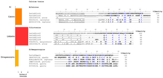 Toxins acting on potassium channels are structurally constrained peptides stabilized by 3 or 4 disulfide bridges [26] that are essentially blockers of the potassium channels. They have been classified into five subfamilies: α-, β-, and γ-KTxs with a cysteine-stabilized α/β motif (CSα/β), the κ-subfamily with a CSα/α motif and the δ-KTx with a Kunitz-type fold. There are also the scorpine-like peptides, proteins with two domains, one of them with sequence similarity to the β-KTxs [27], this being the reason why they are sometimes considered as a subgroup within the β-KTxs. Twenty-one transcripts potentially coding for KTxs were identified in the venom gland transcriptome of T. atrox (Figure 3A).