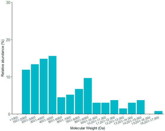 Relative distribution of the MW identified on the venom of T. atrox scorpion. Peptides between 1000 and 5000 Da are the most abundant, covering more than 50% of the components identified on the fingerprint.