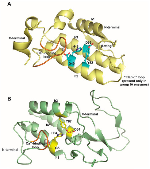 - Berg, O.G.; Gelb, M.H.; Tsai, M.D.; Jain, M.K. Interfacial enzymology: The secreted phospholipase A2-paradigm. Chem. Rev. 2001, 101, 2613–2653. [Google Scholar] [CrossRef] [PubMed]