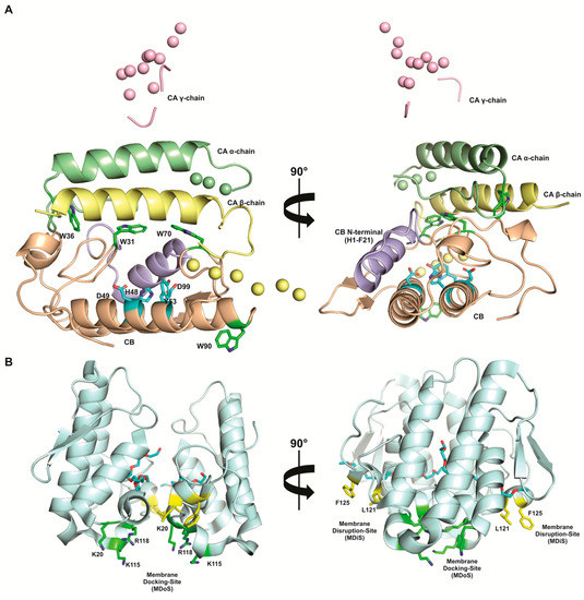 - Fernandes, C.A.H.; Comparetti, E.J.; Borges, R.J.; Huancahuire-Vega, S.; Ponce-Soto, L.A.; Marangoni, S.; Soares, A.M.; Fontes, M.R.M. Structural bases for a complete myotoxic mechanism: Crystal structures of two non-catalytic phospholipases A2-like from Bothrops brazili venom. Biochim. Biophys. Acta Proteins Proteom. 2013, 1834, 2772–2781. [Google Scholar] [CrossRef] [PubMed]