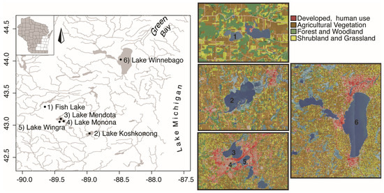 (Left) Map of six study lakes located in Central and South Central Wisconsin, USA; and (Right) United States Geological Survey (USGS) topographical maps of land use for each lake in this study. Numbers on the right correspond to associated lake on the left.