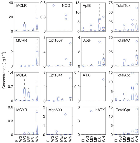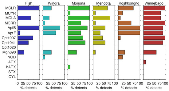 Despite the large number of detects for the majority of these compounds, concentrations were highly variable. For example, MCLR was detected in 100% of samples in Fish Lake, but the Total MC (i.e., sum MCLR, MCLA, MCRR, and MCYR) concentration was never greater than 1.0 µg·L−1 (Figure 3, Table 2). Conversely, for every Lake Winnebago sample, the MCLR concentration was greater than 1.0 µg·L−1, with a mean Total MC of 13.9 µg·L−1. Similarly, AptB and AptF were detected in 80% and 60%, respectively, of Lake Wingra samples and never exceeded 1.0 µg·L−1. However, 60% of all Lake Koshkonong samples had Total Apt concentrations greater than 4.0 µg·L−1, with AptB and AptF being detected in 100% of samples. Similar to MCs, Cpts were detected frequently in Fish Lake and Lake Mendota, but concentrations never exceeded 1.0 µg·L−1. Total Cpt was detected most frequently in Lakes Monona and Winnebago, and was greater than 1.0 µg·L−1 in 80% of Lake Winnebago samples. While hATX was only detected once, it was detected at 5.1 µg·L−1. The max Mgn690 concentration observed was 2.2 µg·L−1 in Lake Koshkonong.