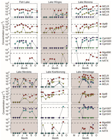 Concentrations of all metabolites detected in this study. The dotted line represents a concentration of 1 µg·L−1, the World Health Organization level for safe drinking water for microcystin, anatoxin-a, and cylindrospermopsin. MC = microcystin; Apt = anabaenopeptin; Cpt = cyanopeptolin; Mgn = microginin; NOD = nodularin; ATX = anatoxin-a; hATX = homo-anatoxin-a.