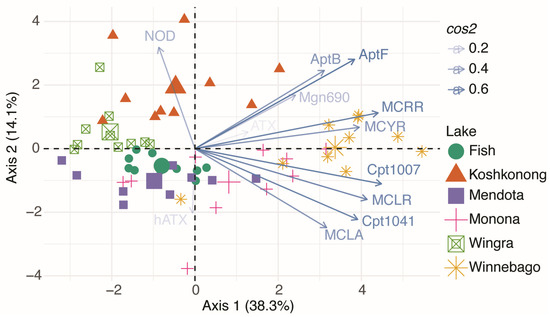 No significant differences existed for NOD, ATX, and hATX due to the infrequent detects and low concentrations. Interestingly, total metabolite concentrations (Figure 4, “TotalTox”) were also not significantly different (p > 0.17), based on non-parametric analysis, between any of the lakes despite significant differences in MC, Apt, and Cpt concentrations. In order to investigate differences in lake metabolite profiles, we performed a principal component analysis (PCA) between lakes, and not surprisingly, samples grouped by lake based on metabolite profile (Figure 5). These differences were significant based on an analysis of similarity (ANOSIM; p < 0.001; R = 0.55). Thus, the milieu of cyanotoxin metabolite mixtures varied significantly between lakes, even lakes of similar trophic status. The importance of each lake or variable in this analysis was defined by cos2, which represents the quality of representation of each variable and is equivalent to the square of the correlation coefficients for each sample. For example, Lake Winnebago had the greatest overall contribution to the variability of the first axis (cos2 = 6.15), which was most influenced by Cpt1007 (cos2 = 0.71), MCRR (cos2 = 0.69), and MCLR (cos2 = 0.61) (Figure 5, Table S1). Conversely, Lake Koshkonong had the greatest contribution to the variability of the second axis (cos2 = 3.08), which was most influenced by NOD (cos2 = 0.36), AptF (cos2 = 0.28), and MCLA (cos2 = 0.22). AptB and MCLR contributed greatly to both axes as they were the most frequently detected compounds overall.