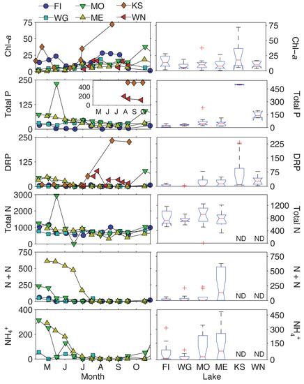 (Left) Temporal trends in chlorophyll-a and nutrient concentrations observed in this study. (Right) Kruskal–Wallis box and whisker plot results of chlorophyll-a and nutrient concentrations between lakes. The central line represents the median. The top and bottom of the box represents the 25th and 75th quartiles, respectively. The whiskers extend to data points that are not considered outliers, which is ±2.7 standard deviation from the mean, and plus symbols are outliers. Notches that do not overlap represent significant differences in metabolite distributions. Note that for Lake Koshkonong and Lake Winnebago, n = 3 for total phosphorus. Chl-a = chlorophyll-a; total N = total nitrogen; total P = total phosphorus; N + N = nitrate + nitrite; DRP = dissolved reactive phosphorus; NH4+ = ammonium. FI = Fish Lake; WG = Lake Wingra; MO = Lake Monona; ME = Lake Mendota; KS = Lake Koshkonong; WN = Lake Winnebago; ND = no data.