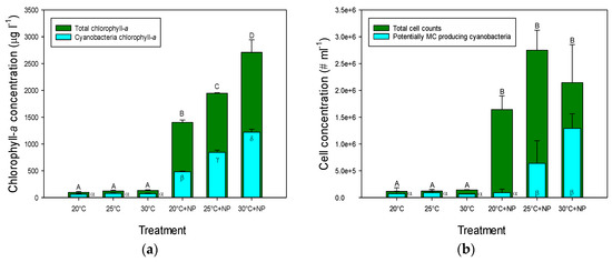 (a) Cyanobacterial- and total chlorophyll-a concentrations (μg·L−1) in incubations of water samples from an urban pond incubated for one week at three different temperatures without and with addition of NaNO3 and K2HPO4 (+NP) to mimic warming and eutrophication; (b) Total phytoplankton cell concentrations (cells·mL−1) and cell concentrations for potential microcystin (MC) producing species. Error bars indicate 1 SD (n = 3), while different symbols (A,...,D; α,...,δ) indicate groups that are statistically different (Tukey test; p < 0.05).