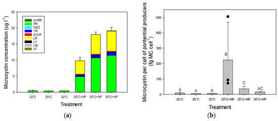 (a) Concentrations of different microcystin (MC) variants (μg·L−1) in water samples from an urban pond that had been incubated for one week at three different temperatures without and with addition (+NP) of NaNO3 (14 mg N·L−1) and K2HPO4 (1.4 mg P·L−1) to mimic warming and eutrophication; (b) Total MC per cell (fg MC·cell−1) for potentially microcystin (MC) producing species. Error bars indicate 1 SD (n = 3), while different symbols (A,...,C) indicate groups that are statistically different (Tukey test; p < 0.05). Black circles in the 20 °C + NP treatment are the individual replicates.
