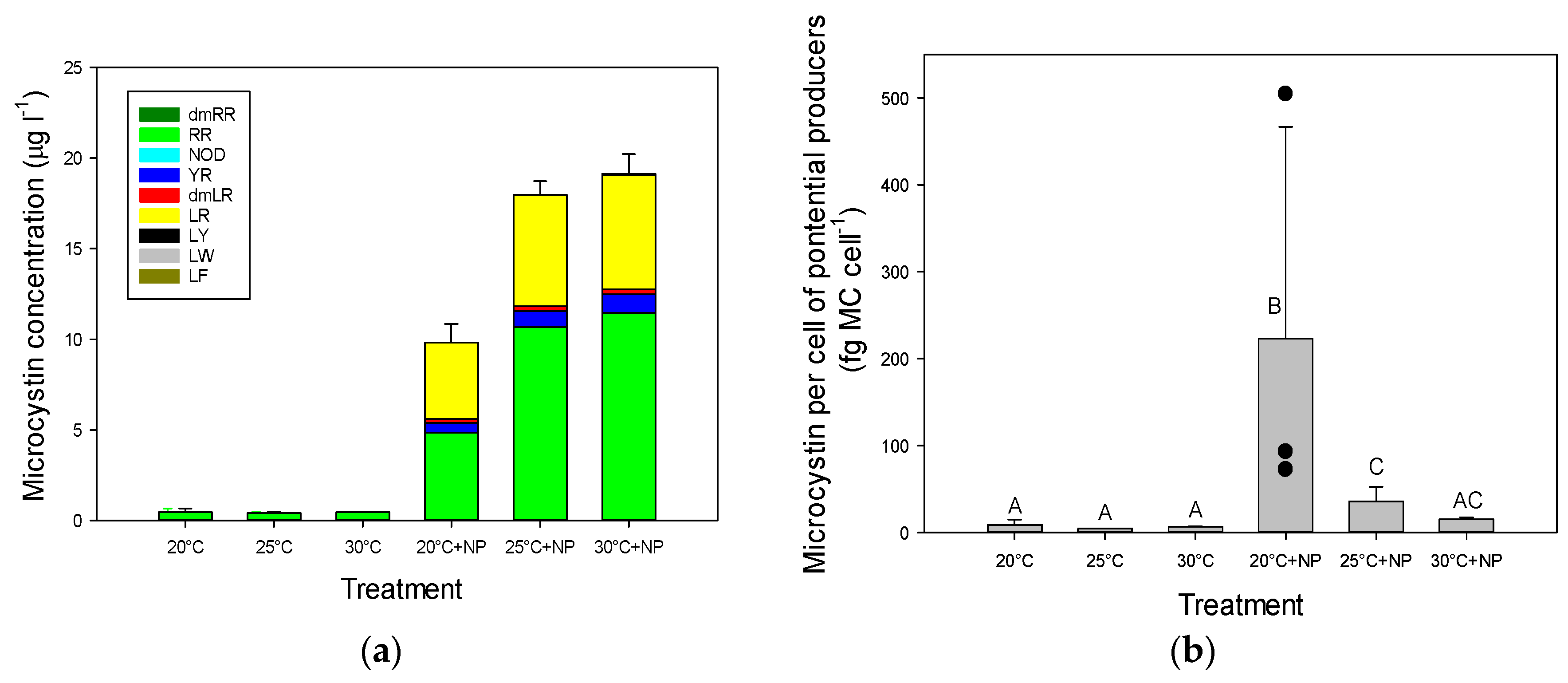 - Liu, J.; Van Oosterhout, E.; Faassen, E.J.; Lürling, M.; Helmsing, N.R.; Van de Waal, D.B. Elevated pCO2 causes a shift towards more toxic microcystin variants in nitrogen-limited Microcystis aeruginosa. FEMS Microbiol. Ecol. 2015, 92, fiv159. [Google Scholar] [CrossRef] [PubMed]