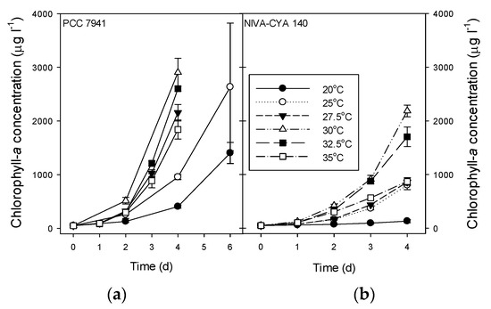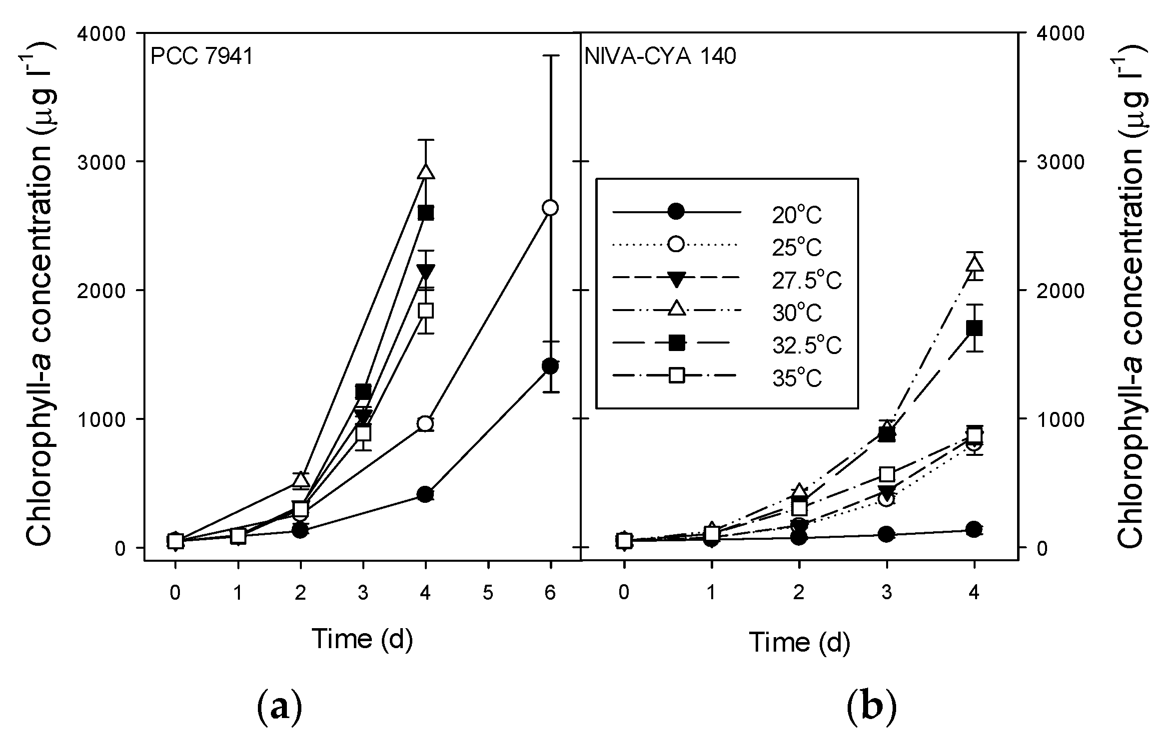 (a) Course of the chlorophyll-a concentrations (μg·L−1) of Microcystis aeruginosa PCC7941 cultured at six different temperatures (20–35 °C); (b) Course of the chlorophyll-a concentrations (μg·L−1) of Ms aeruginosa NIVA-CYA140 cultured at six different temperatures (20–35 °C); Error bars indicate 1 SD (n = 3).