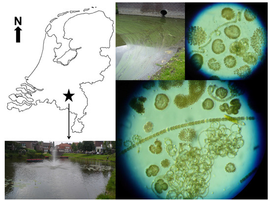 Location of pond Molenwiel in The Netherlands (★), as well as pictures of the pond on 29 July, 2011 (left below), a minor surface accumulation and the main phytoplankton species in this accumulation.