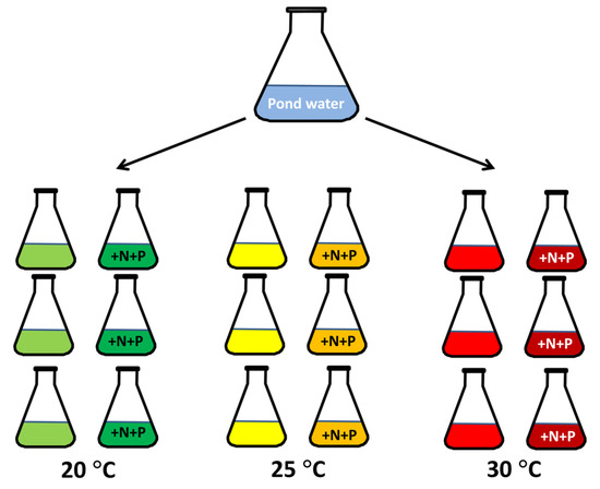 The design used in the experiment in which water from the urban pond Molenwiel was transferred into 100 mL Erlenmeyer flasks that were either enriched with nutrients (+N + P; 14 mg·N·L−1 as NaNO3 and 1.4 mg·P·L−1 as K2HPO4) or received no additional nutrients and that were incubated for seven days at 20, 25, or 30 °C (Figure A3).