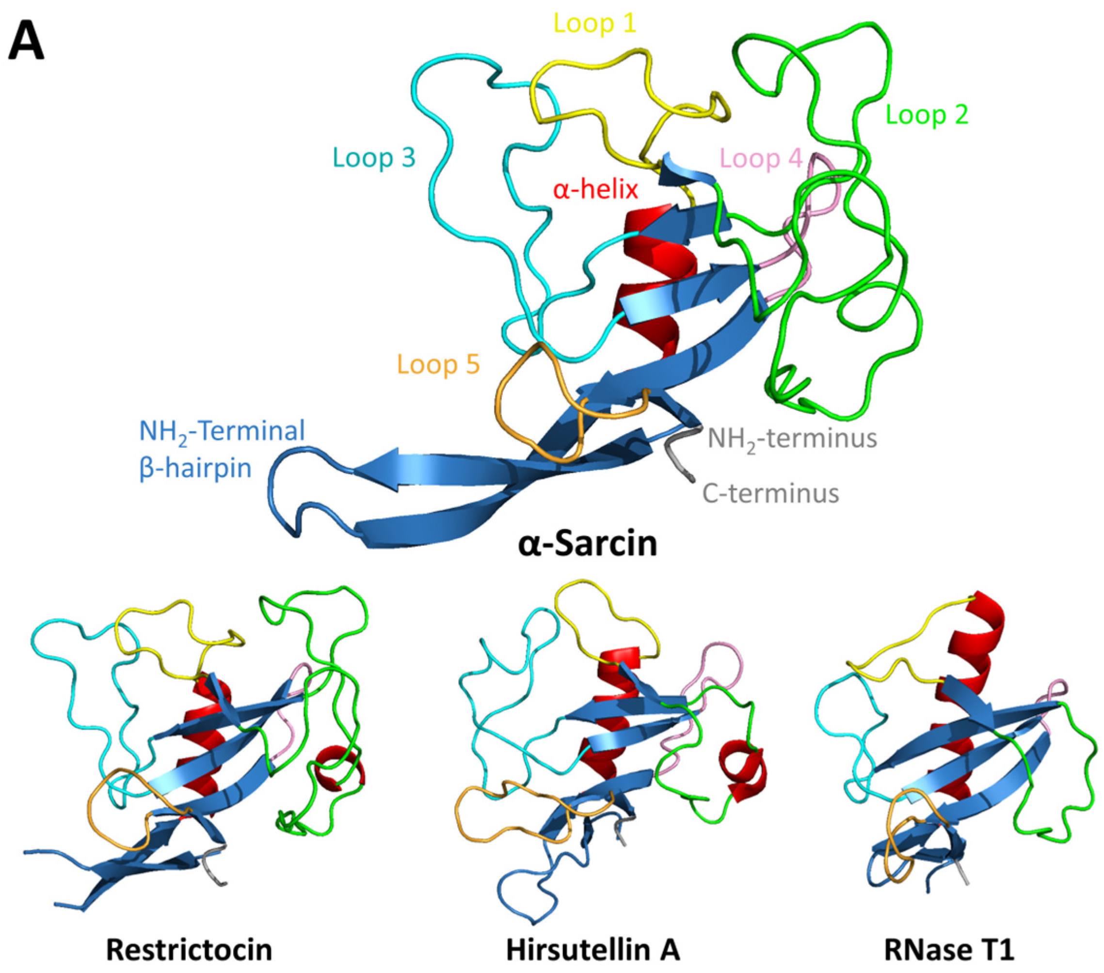 - Lacadena, J.; Álvarez-García, E.; Carreras-Sangrà, N.; Herrero-Galán, E.; Alegre-Cebollada, J.; García-Ortega, L.; Oñaderra, M.; Gavilanes, J.G.; Martínez-del-Pozo, A. Fungal ribotoxins: Molecular dissection of a family of natural killers. FEMS Microbiol. Rev. 2007, 31, 212–237. [Google Scholar] [CrossRef] [PubMed]
