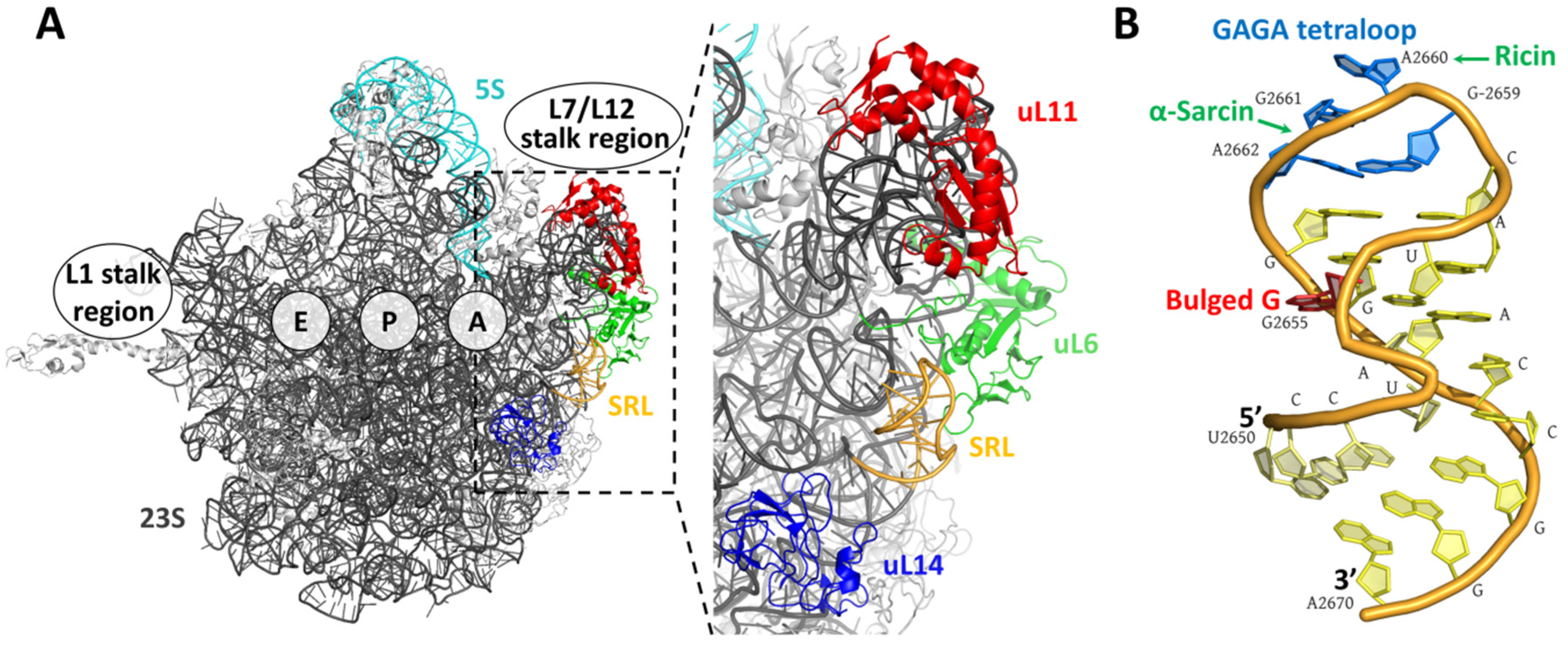 The target of ribotoxins: the ribosome. (A) Three-dimensional structure of the large ribosomal subunit of Escherichia coli (PDB ID: 2AW4). The location of L1 and L7/L12 stalks (absent in this crystal) and E, P and A sites are indicated. Conserved proteins around the SRL (orange) appear in different colors: uL6 (green), uL11 (red), uL14 (blue). Other ribosomal proteins appear in light gray. 23S (dark gray) and 5S (cyan) rRNAs are also shown; (B) SRL structure. The bulged G (red), the GAGA tetraloop (blue), the bond cleaved by α-sarcin and the adenine depurinated by ricin, are indicated.