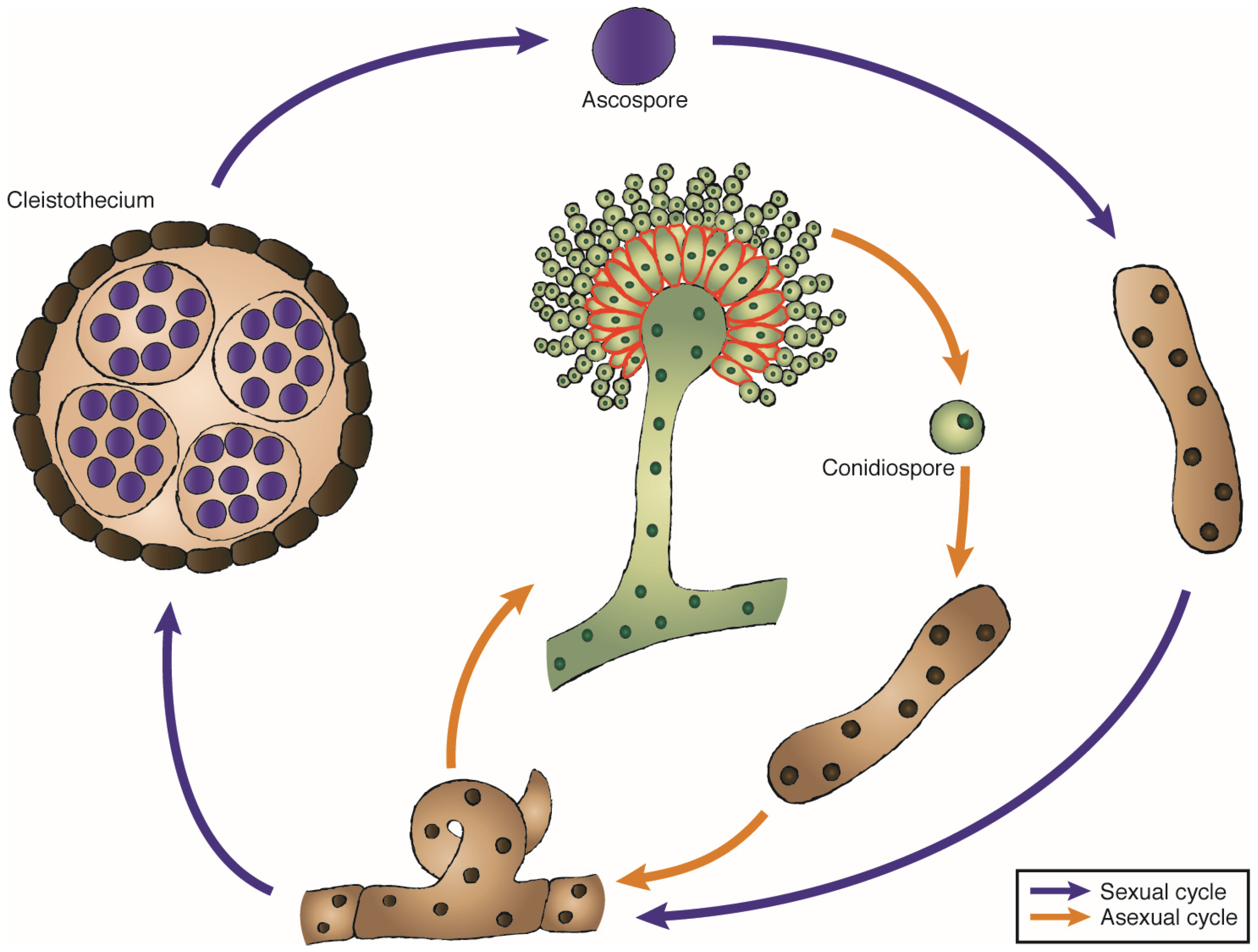 Life cycle of Aspergillus and suggested localization of ribotoxins. Aspergillus can enter a sexual or an asexual reproductive cycle. During the sexual cycle, the mycelium forms a fruiting body, the cleistothecium, which holds the ascospores that once released into the environment can form a new mycelium. In the asexual reproduction, the mycelium differentiates into identical asexual spores or conidiospores. Ribotoxins would be produced during maturation of the conidia, and would be located on the edge of the phialides (shown in red). Additionally, a parasexual cycle can take place in Aspergillus (not shown).