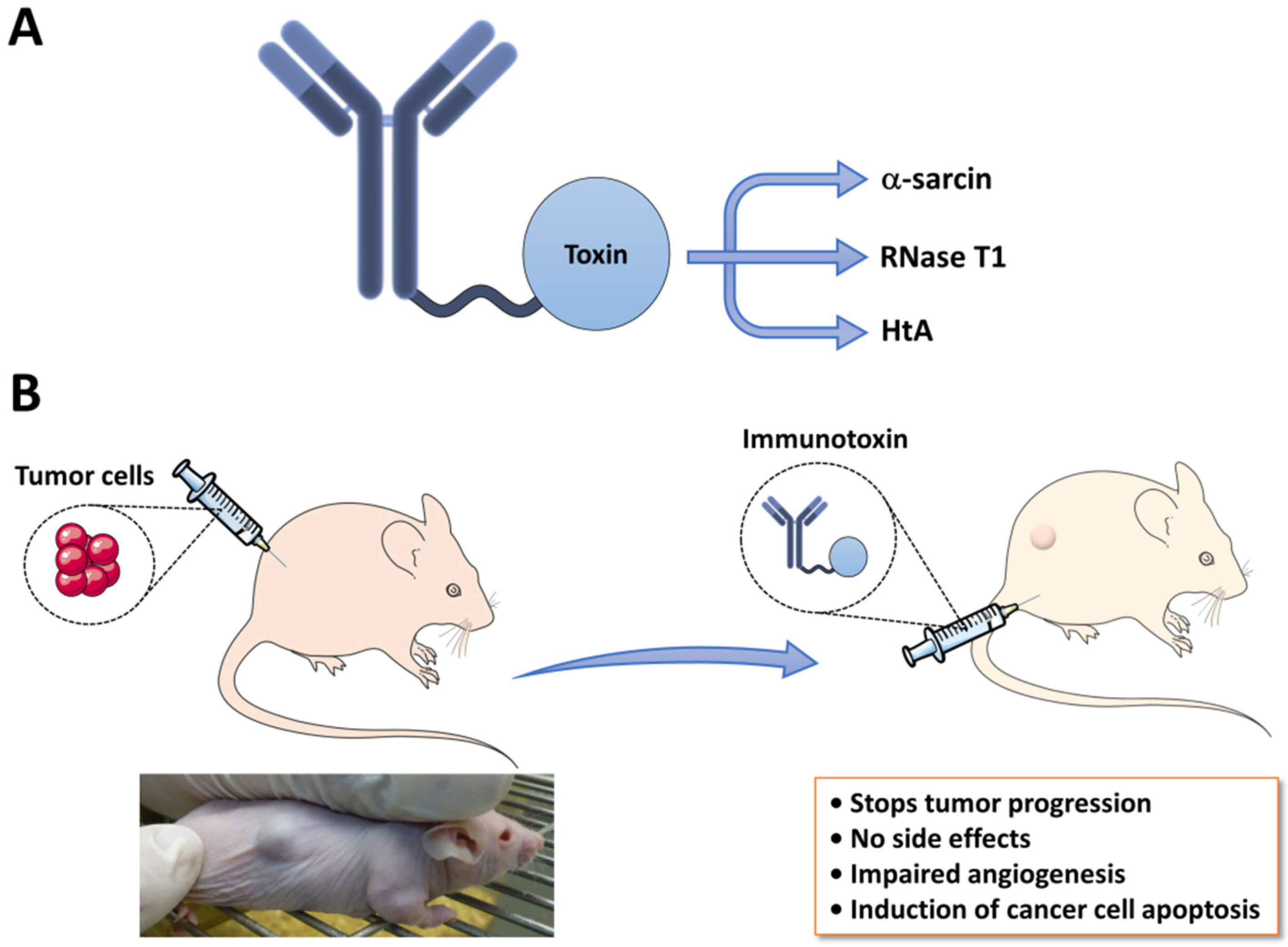 Ribotoxins as immunotherapeutic agents. (A) General structure of an immunotoxin, composed of a specific antibody fragment responsible for targeting to a specific cell type linked to a toxin moiety, ribotoxins or non-toxic ribonucleases like RNase T1, which promote cell death; (B) IMTXA33αs, an immunotoxin that contains α-sarcin as the toxic domain, has been tested in nude mice.