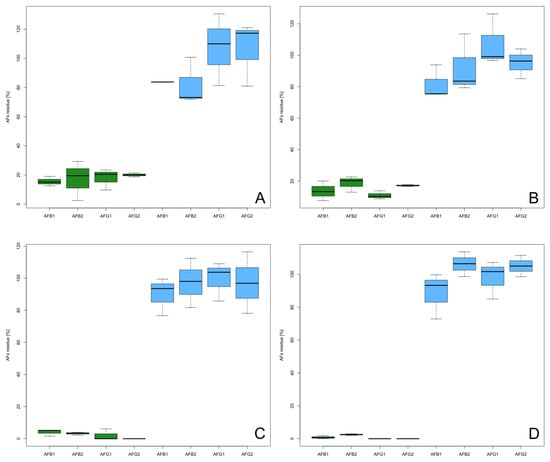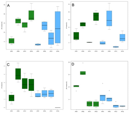 Residual AFB1, AFB2, AFG1, and AFG2 on hazelnuts (green) and perisperm (blue). (A) 120 °C for 20 min with static hot air roaster; (B) 120 °C for 40 min with static hot air roaster; (C) 140 °C for 20 min with infrared rays roaster; (D) 140 °C for 40 min with infrared rays roaster. All treatments were applied on TGT hazelnuts. Boxes and whiskers meaning is described in Figure 1.