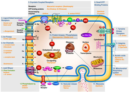 Overview of the signal transduction portals (blue) modulated by bacterial, plant and animal toxins (orange). The portals presented are numbered from 1–13 (starting from bottom left side) indicating the paragraphs in Section 2 where they are discussed. The left part of the figure highlights ionic channels and ionotropic receptors, which regulate intracellular ion concentration and may lead to Ca2+ overload, as well as to a separation of plasma membrane lipid domains and pore formation (green); the top part of the figure illustrates the G-Protein Coupled Receptors (GPCR) systems, generating second messengers such as cAMP and IP3. The right part of the figure describes tyrosine kinase and integrin receptors, and indicates the targeting of nucleic acid and the mitochondrial respiratory system; the bottom part presents ribosomes and vesicular release. Protein kinases and phosphatases activated by second messenger, are indicated inside the cell.