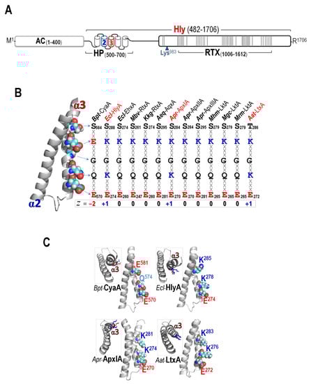 Further analysis via multiple alignments of corresponding CyaA-Hly α3 sequences among the thirteen RTX cytolysins shown in Figure 1B revealed variations in their net charge (z) that can be categorized into three groups: (i) a negatively-charged patch (z = −2) of CyaA-Hly, containing Glu570/Gln574/Glu581; (ii) a positively-charged patch (z = +1) of HlyA, ApxIA, and LtxA, containing Glu/Lys/Lys; and (iii) a neutral patch (z = 0) of nine other RTX cytolysins, containing Glu/Gln/Lys. It is important to note that the group with z = +1 (i.e., Ecl-HlyA, Apr-ApxIA, and Aat-LtxA) exhibited a very strong hemolytic activity while the group with z = −2 (i.e., CyaA-Hly) displayed a relatively weak activity [,,,]. Thus, such surface net-charge variations in the pore-lining helix of these RTX cytolysins could reflect their different degrees of hemolytic/pore-forming activities.