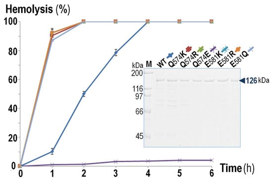 Time-course of hemolytic activity against sheep erythrocytes of individual purified toxins (10 μg/mL) as indicated. The control for 100% hemolysis is susceptible sheep erythrocytes with respect to a complete lysis when treated with 0.1% Triton X-100. Subset: SDS-PAGE (10% gel) of the Ni2+-NTA purified CyaA-Hly toxins, both wild-type (WT) and mutants (Q574K, Q574R, Q574E, E581K, E581R, and E581Q). Bands of CyaA-Hly toxins 126 kDa in length are marked by an arrow.