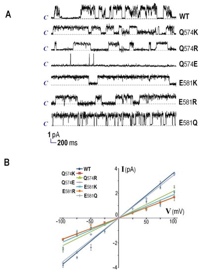 Remarkably, the channels induced by these positive-charge substituted mutants: Q574K, Q574R, E581K, and E581R, appeared to have significant longer open lifetimes (i.e., 1620, 2980, 1920 and 2500 ms, respectively) than that induced by wild-type toxin (~235 ms) while the E581Q mutant’s channel exhibited a slightly shorter lifetime (~150 ms) (see Table 1). In addition, all the active mutants showed a marked increase in the open channel probability (0.78, 0.53, 0.71, 0.82, and 0.76 for Q574K, Q574R, E581K, E581R, and E581Q, respectively) compared to the wild-type toxin (0.29). It is possible that the channel interior with less negative charge could prolong open-channel lifetimes and increase open-channel probability, conceivably accounting for their enhanced hemolytic activity. As revealed in certain ion channels and transporters, the preference of charged residues at particular locations inside the pores can affect their structural arrangement through interactions between neighboring oppositely-charged residues [,,]. However, all four hemolytically-active mutants substituted with a positive charge (i.e., Q574K, Q574R, E581K, and E581R) appeared to produce single-channels with about a half decrease in maximum conductance compared to the wild-type and E581Q mutant toxins as demonstrated above (see Figure 3). Therefore, an introduced positively-charged side-chain at these two positions could perhaps disturb cation-conducting ability of CyaA-Hly channels, implying the disparate manners of CyaA-Hly in regulating between its hemolytic pore formation and ion-conduction.