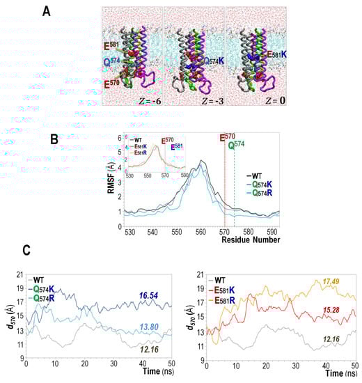 (A) MD simulations (50 ns) of trimeric CyaA-Hly channel models in membrane of the wild-type (WT, left) and two representative mutants; Q574K (middle) and E581K (right). Total net charges (z) inside the pores are shown; (B) Cα-RMSF profiles (Arg528–Ala593) obtained from MD trajectories of 50-ns simulations of individual CyaA-Hly pore structures; and (C) the average separation distance (Cα to Cα) between three Glu570 residues on the trimeric CyaA-Hly pore models versus time during 50-ns MD simulations. Left and right panels represent the systems of Gln574 and Glu581 mutants compared to the wild-type, respectively.