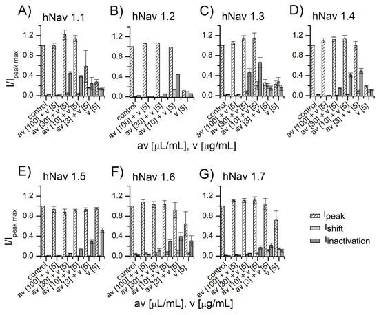 The mixture of 30 µL/mL of antivenom plus venom still showed full protection for the channel sub-types hNav 1.2, hNav 1.5, hNav 1.6, and hNav 1.7, but only partial protection for hNav 1.1, hNav 1.3, and hNav 1.4. The two latter channel sub-types appeared to be most sensitive to the venom. As shown in Figure 2, the antivenom acts in a dose-dependent manner: at lower concentrations (i.e., 10 and 3 µL/mL), the venom effect is still evident—albeit reduced—compared to its effect in the absence of antivenom.