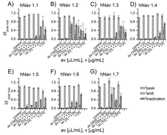 We found that the venom of both species changed the voltage-gated dependence of the sodium currents in a similar way, but with different potencies depending on the type of the venom and the channel sub-type. An example of the venom effect is depicted in Figure 1, where Bm venom was applied to the hNav 1.3 sodium channel. After exposure to 3 µg/mL of the venom, the channels started to open at more negative potential (Ishift, Figure 1B,C), probably due to the effect of toxins of the beta type; at the same time, channels suffered a delay in the inactivation process (Iinact, Figure 1B,C), probably due to the toxins of the alpha type. In most cases, the peak current (Ipeak) initially increased and then decreased (Figure 1C). The progressive loss of current also reflects the effects of alpha and beta toxin that are described to increase or reduce the total current. We noticed that the delay of inactivation was in general predominant over the shift of activation, indicating that in the Am and Bm venoms, the effect of the alpha toxins is more prevalent than that of the beta toxins.