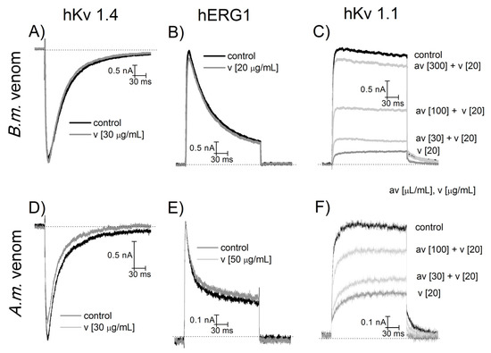 NA scorpion antivenom protection against Am and Bm venom in potassium channels. Potassium channels of the type hERG, hKv 1.1 and hKv1.4 were recorded in control (black traces in A–F) and after application of Bm (A–C) and Am (D–F) venoms (dark gray traces). Both venoms reduce hKv 1.1 current. Antivenom, applied at different concentrations, prevents the blocking effect of both venoms in a dose-dependent manner (light grey traces in C and F).