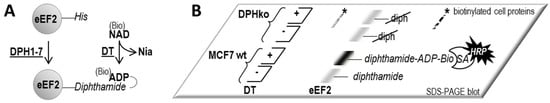 - Stahl, S.; Seidl, D.M.; Rita, A.; Ducret, A.; Geijtenbeek, S.V.; Michel, S.; Racek, T.; Birzele, F.; Haas, A.K.; Rueger, R.; et al. Loss of diphthamide pre-activates NF-κB and death receptor pathways and renders MCF7 cells hypersensitive to tumor necrosis factor. Proc. Natl. Acad. Sci. USA 2015, 112, 10732–10737. [Google Scholar] [CrossRef] [PubMed]