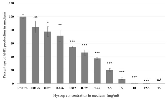 Aflatoxin B1 (AFB1) production as a function of hyssop concentration. Malt extract agar (MEA) medium was supplemented with increasing concentrations of hyssop extract ranging from 0.0195 to 15 mg/mL and cultivated at 27 °C, in the dark, for 8 days. AFB1 concentrations were quantified through HPLC/FLD. Results are expressed as mean % ± SEM (n = 3). ns = no significant changes; nd = not detectable; * p-value < 0.05; ** p-value < 0.01; *** p-value < 0.001.