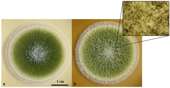 Phenotype of A. flavus strain NRRL62477 after four days of culture at 27 °C in MEA medium or MEA medium supplemented with 10 mg/mL of hyssop aqueous solution. (a) Control culture grown on a regular MEA medium; (b) MEA medium was supplemented with 10 mg/mL of aqueous solution of hyssop; (c) Magnification of the aerial mycelium covering the hyssop treated culture.