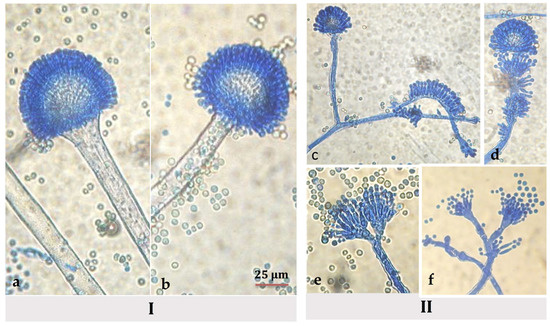 Microscopic views (x400) of A. flavus NRRL 62477 conidiophores in the (I) basal mycelium on (a) MEA medium and (b) MEA supplemented with 10 mg/mL of hyssop extract, and the (II) aerial mycelium showing the development of anarchic philalides when strain was grown on a hyssop-treated MEA medium; (c) and (d) development of anarchic philalides; (e) conidiophore bearing two vesicles and (f) presence of short conidiophores with columnar heads.