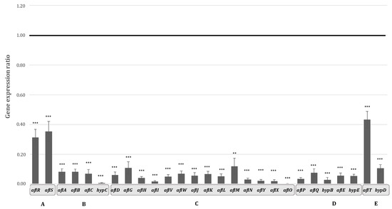 Expression of genes belonging to AFB1 cluster genes in the presence of 10 mg/mL of hyssop aqueous extract; (A) internal cluster regulators (B) genes involved in the earlier steps of AFB1 enzymatic cascade leading to the formation of norsolorinic acid (C) genes involved in the middle steps of the AFB1 enzymatic cascade converting norsolorinic acid into sterigmatocystin (D) genes involved in the final steps of the cascade leading to AFB1 synthesis (E) genes with uncharacterized functions. Black line represents the expression level of control. ** p-value < 0.01; *** p-value < 0.001.