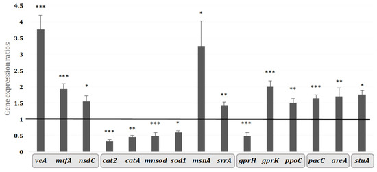 Schematic representation of gene expression ratios of the different regulatory genes affected upon 10 mg/mL hyssop supplementation of MEA media. Genes are grouped into the five categories described above. The black line represents the expression level of genes in control cultures. * p-value < 0.05; ** p-value < 0.01; *** p-value < 0.001.