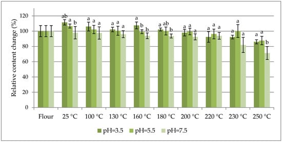 The percentage change in content of sum of total fumonisins normalized to their concentration in flour (as 100%) vs. baking temperature of dough prepared in three different buffers (pH = 3.5, 5.5, 7.5). Letters denote statistically homologous groups.