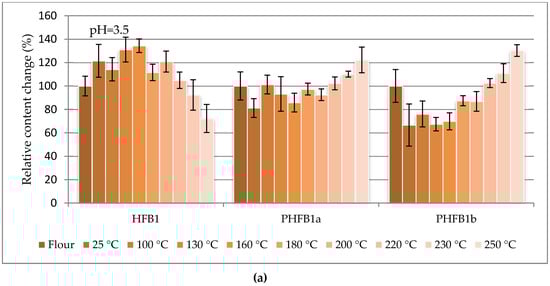 The percentage change in content of HFB1, PHFB1a and PHFB1b normalized to their concentration in flour (as 100%) vs. baking temperature of the dough prepared in various buffers (pH = 3.5 (a), pH = 5.5 (b), and pH = 7.5 (c)) charted on the basis of the intensity of the given fumonisin peak normalized to the intensity of the 13C-FB1 internal standard peak. HFB1: hydrolysed B1 fumonisin; PHFB1a: partially hydrolysed fumonisin B1 (isomer a); PHFB1b: partially hydrolysed fumonisin B1 (isomer b).