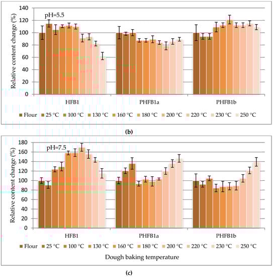 Among the three investigated buffer pH values in which the dough was prepared (3.5, 5.5, and 7.5), the thermal stability was highest at pH = 5.5. At that latter pH, within the entire range of the investigated baking temperatures, the concentration of the free forms stayed within the +18/−9% range, the total concentration stayed within the +8/−11% range, and the HFB1 concentration stayed within the +1/−23% range.