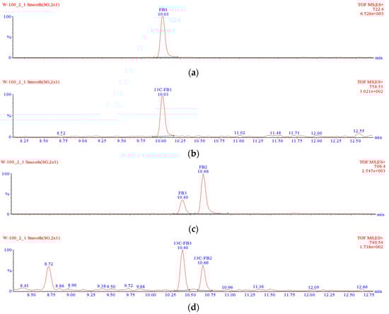 Typical chromatogram of free fumonisins in maize using a time-of-flight (TOF) mass spectrometer: FB1 (a); 13C-FB1 (b); FB2 and FB3 (c); 13C-FB2 and 13C-FB3 (d).