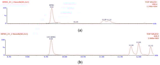 An Acquity H-Class high-performance liquid chromatograph coupled to an LCQ Premiere XE high resolution time-of-flight mass spectrometer (Waters, Milford, MA, USA) was used as the analytical instrument. Analytes were separated on a UPLC C18 Cortecs chromatographic column (2.1 × 100 mm, 1.6 µm; Waters, Milford, MA, USA) with a pre-column at its front. The mobile phase was composed of methanol and water. Both phases contained 0.2% formic acid, while phase B additionally contained 2 mM ammonium formate. The flow rate was 0.4 mL/min. The following gradient was used: 1%–50% A from 0 to 8 min; 50%–95% A from 8 to 11 min; constant 95% A from 11 to 22 min; 95%–1% A from 22 to 22.6 min; and constant 1% A from 22.6 to 27 min. Samples of 2.5 μL were injected onto the column. The mass spectrometer was operated in the positive electrospray ionization mode (ESI). The ion source and desolvation temperatures were 150 °C and 350 °C, respectively. The nebulizing gas (nitrogen) flow rate was 750 L/min and the cone gas flow rate was 20 L/min. The capillary voltage was 3000 V. The V mode of the ion optics was used. The mass spectrometer was calibrated using a standard solution of leu-enkefalin. The following precursor (M + H)+ ions (m/z) were registered for individual analytes: FB1, 722.4; 13C-FB1, 756.5; FB2 and FB3, 706.4; 13C-FB2 and 13C-FB3, 740.5; HFB1, 406.4; PHFB1a and b, 564.4; PHFB2a and b and PHFB3a and b, 548.4; 13C-HFB1, 428.5; HFB2 and HFB3, 390.4; and 13C-HFB2 and 13C-HFB3, 512.5.