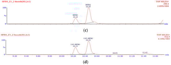 Typical chromatogram of hydrolysed fumonisins in maize using a TOF mass spectrometer: HFB1 (a); 13C-HFB1 (b); HFB2 and HFB3 (c); 13C-HFB2 and 13C-HFB3 (d).