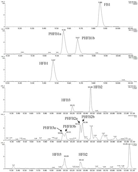 A 1.25-g well-ground sample was transferred into a 50-mL beaker, spiked with 10 µL of the 13C-FB1/13C-FB2/13C-FB3 internal standard solution, and homogenized with 10 mL of methanol:acetonitrile:water solution (25:25:50 V/V/V) for 3 min to extract the analytes. The extract was transferred into a 15 mL PP centrifuge tube and centrifuged at 10,730× g. Two millilitres of the supernatant were transferred into a round bottom flask and evaporated to dryness using a rotary evaporator. The dry residue was re-dissolved in 1 mL of a 30:70 methanol:water mixture and sonicated in an ultrasound bath. The solution was filtered through a 0.2-µm nylon syringe filter and transferred into some glass vials, followed by analysis with the liquid chromatography–time-of-flight mass spectrometry–high resolution mass spectrometry (LC-TOF-MS) system. A typical chromatogram showing the separation of free fumonisins is shown in Figure 4.