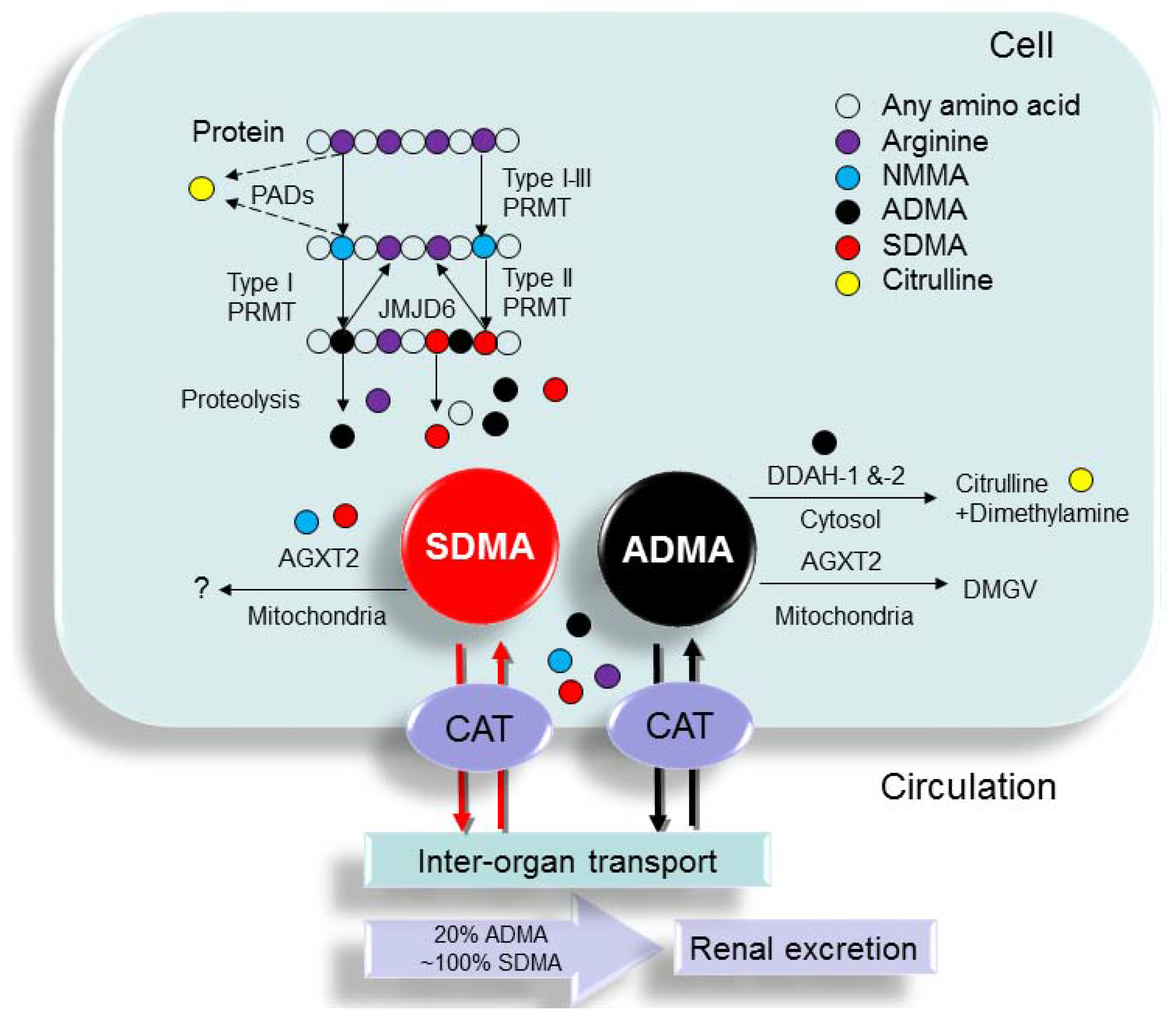 Schema outlining the synthesis and metabolism of ADMA and SDMA. Protein arginine (purple circle) methylation is performed by a family of enzymes termed protein arginine methyltransferases (PRMTs), which methylate protein-incorporated l-arginine residues to generate protein-incorporated NG monomethyl-l-arginine (NMMA; blue circle). Type I PRMTs generate asymmetric dimethylarginine (ADMA; black circle) and type II PRMTs convert NMMA to symmetric dimethylarginine (SDMA; red circle). Protein-incorporated l-arginine residues can also be converted to citrulline (yellow circle) by peptidylarginine deaminases (PADs), thereby blocking methylation on the arginine residue. Upon proteolytic cleavage of arginine-methylated proteins, free ADMA and SDMA are released into the cytoplasm. ADMA and SDMA can be moved out of the cells via cationic amino acid transporter (CAT) and transported to other organs or excreted in urine. ADMA can be converted to l-citrulline and dimethylamine by dimethylarginine dimethylaminohydrolase-1 (DDAH-1) and -2 (DDAH-2). Alanine-glyoxylate aminotransferase 2 (AGXT2), a mitochondrial aminotransferase expressed primarily in the kidney, can metabolize ADMA as well as SDMA. ADMA can be transaminated by the enzyme AGXT2 to α-keto-δ-(NG,NG-dimethylguanidino) valeric acid (DMGV).