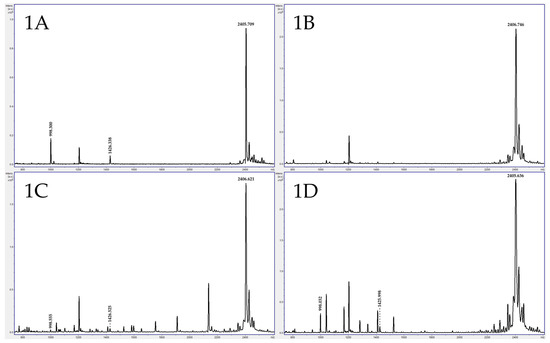 A typical BoNT/A positive control from the Bruker MALDI Biotyper has an intact peptide substrate at 2406 m/z and two peptide fragments at 998 and 1426 m/z (1A); One patient exhibited negative BoNT/A in serum (1B, 14-17944-01); however, a low concentration of BoNT/A was detected by MS in stool from the same patient (1C, 14-17944-02), whereas the mouse bioassay was negative for both specimen types. The patient specimen results were later confirmed when the contaminated food the patient ingested was positive for BoNT/A by MS (1D, 14-18209) and the mouse bioassay.