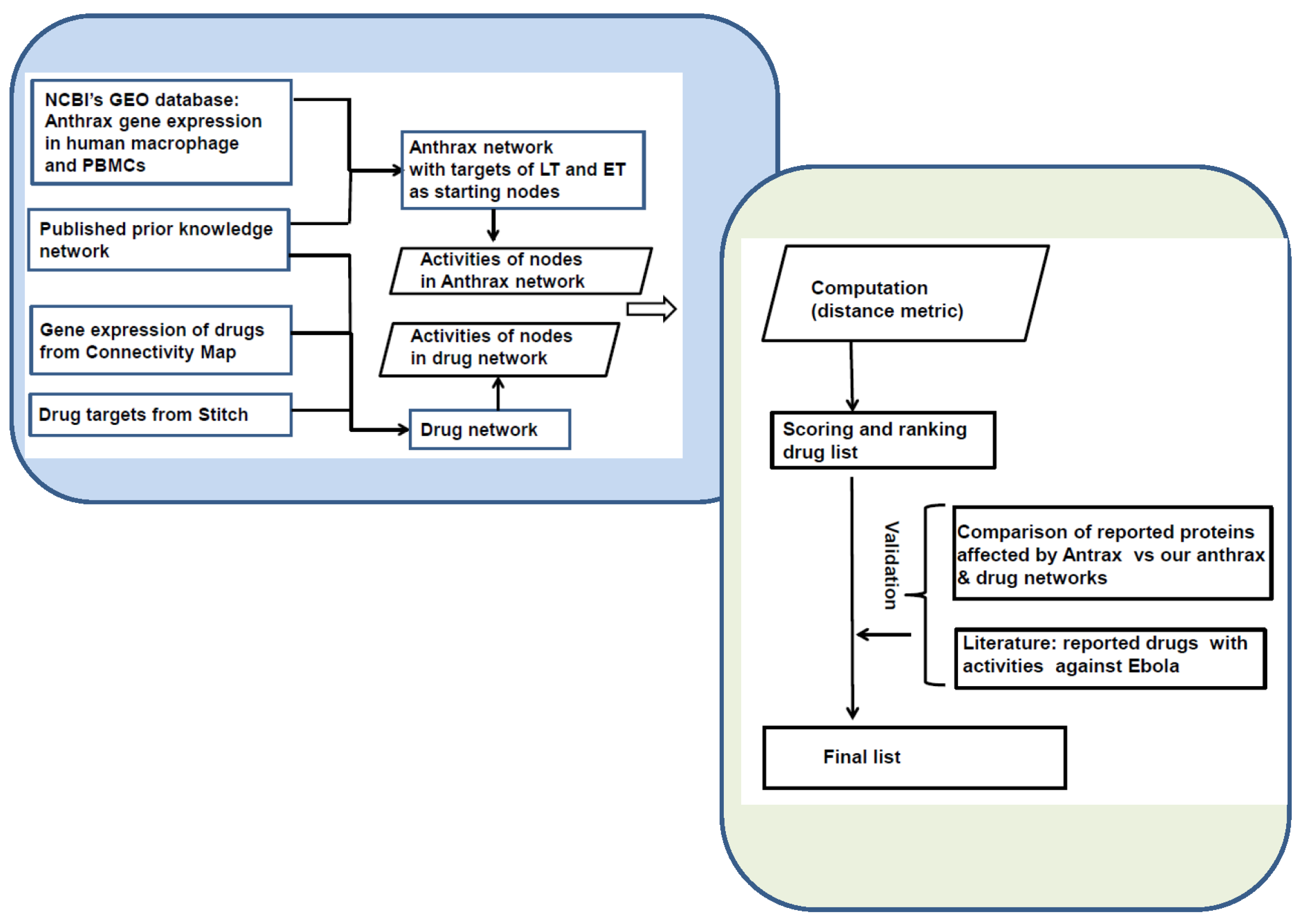 Project workflow: (1) construction of anthrax networks and individual drug networks; (2) computationally scoring individual drugs by computing the distance between anthrax networks and individual drug networks; (3) validation of computed scores and rankings by referencing the literature. We used gene expression data from the Gene Expression Omnibus, prior knowledge network of protein interaction and molecular targets of anthrax toxins in host cells for anthrax networks. Individual drugs’ networks were constructed with gene expression data from the Connectivity Map, prior knowledge network of proteins and their respective targets from STITCH.