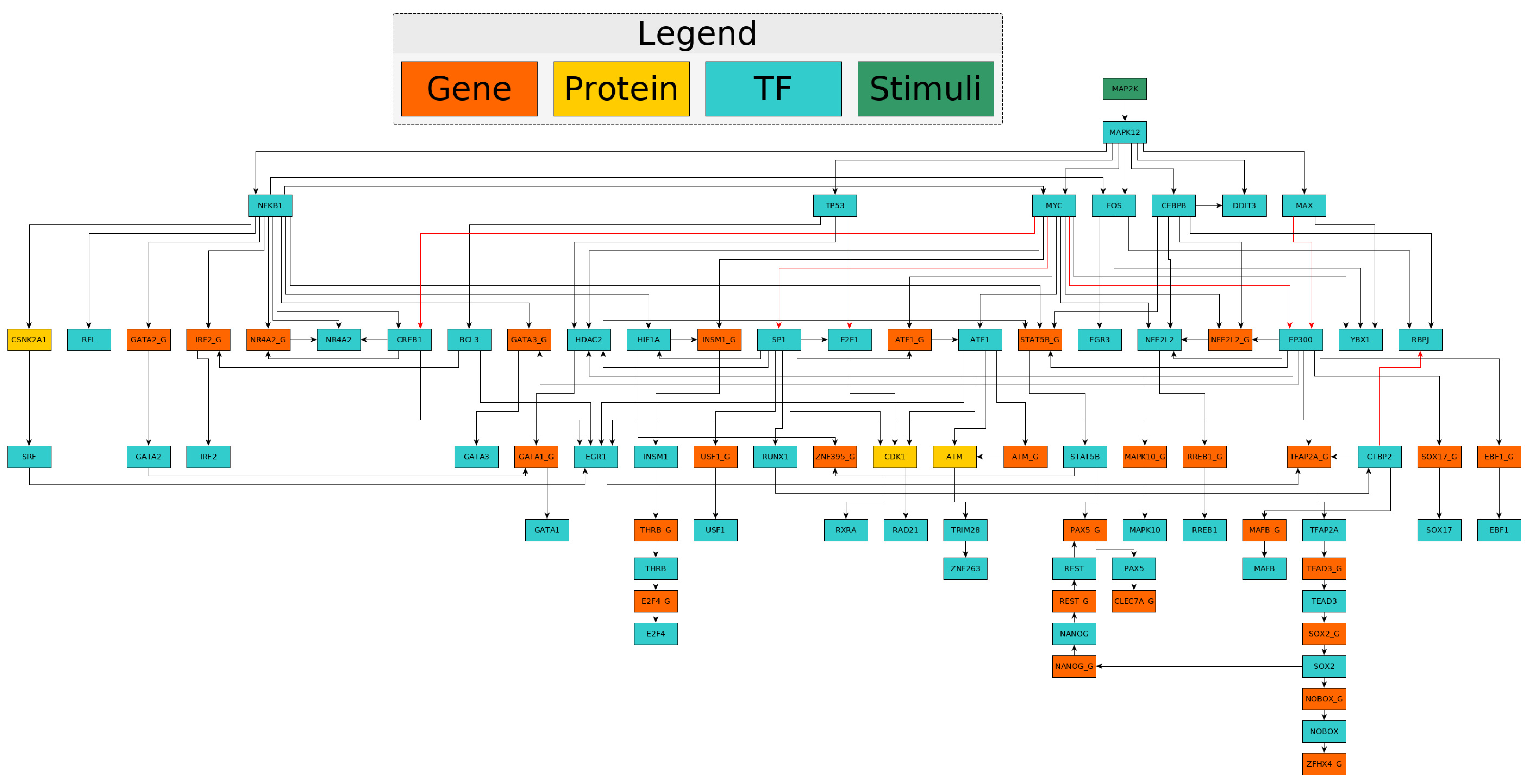 Because HAM was treated with anthrax spores, we used it as the starting nodes (stimuli) of the signal transduction the targets of both Lethal Toxin (LT), i.e., the MAPKs and NOD-like receptor (NLRP1), and of the Edema Toxin (ET). NLRP1 was reportedly targeted and cleaved by LT, consequently activating inflammasome in rodents [28]. Though the role of NLRP1 in activating inflammasome in human cells is not clearly defined [29], NLRP1 was included because of NLRP1 inflammasome activity in human diseases [30]. Since ET increases the level of cAMP that targets protein kinase A (PKA) [6] and Epac (a RAP1 guanine-nucleotide-exchange factor [31]), we used ET’s secondary targets, i.e., PKA & RAP1 (see Supplementary Materials Table S3, inputs_cells: inputs_ham & inputs_pbmc). Considering the GEO database, PBMC cells were treated with LT directly, PKA and RAP1 were left unperturbed in our computation. Since the algorithm was optimized only over the nodes of the network, as a final result we provided only the nodes included in the final network (see Supplementary Table S4, xs_cells: xs_ham & xs_ham) as well as the images of the final networks (see Figure 2 for HAM network).